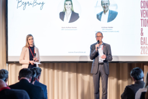 ÖFV Generalsekretärin Karin Kufner-Humer und ÖFV Präsident Andreas Haider begrüßen die Teilnehmer*innen bei der „ÖFV Convention“ am 11. Mai 2023 in der Burg Perchtoldsdorf